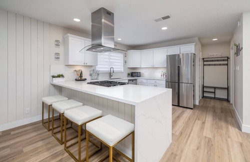 Exquisite Modern/Contemporary single story home with RV Parking minutes from Summerlin, Shopping, Trader Joes, Whole Foods, Sprouts, Parks and major freeways. Enjoy the solitude of this mature neighborhood in this completely remodeled property featuring a private front courtyard and large rear yard for your furry friends. Fully fenced property w/ tall privacy walls, covered patio, security gates, bbq, turf and mature landscaping. The kitchen is fully stocked for cooking, Nook w/4 barstools, Pantry, Coffee/Tea Bar, 2 Refrigerator/Freezers, dimmable recessed lighting and features quartz counter tops with waterfall & stainless steel farm sink. Grand dining room w/6 seat dining room table, electric fireplace, ship lap walls, exterior access to backyard and dimmable recessed lighting. Tile & Luxury Vinyl Planks thru-out, Shutters/Zebra Blinds, 65" Smart TV in Living Room w/ Electric Fireplace. All Bedrooms/Bath are fully equipped with towels/linens. Close proximity to the Strip, Red Rock, Mt Charleston and Downtown. If you are looking to relax and enjoy a clean & modern property centrally located this is your spot. The primary and secondary bedroom both have wall mounted TV's. Property has multiple ceilings fans, new AC, large laundry room and 2 car garage. The front courtyard is fully fenced w/ furniture, turf, flower bed and custom lighting. Enjoy the morning sun or afternoon shade while sipping your favorite beverage. This is a quiet, mature neighborhood and the property is designed for working from home or relaxing. Awesome property for RV & Dogs, the property is fully gated for your peace of mind. Home is professionally cleaned and has starter amenities with coffee/tea, dish soap, laundry soap, shampoo/conditioner, toothbrush, toilet paper & paper towels. The laundry room has an ironing board, ironing blanket and iron with a laundry basket. Each room is equipped with its own laundry basket and 3 sets of linens. Come enjoy the serenity this property offers..