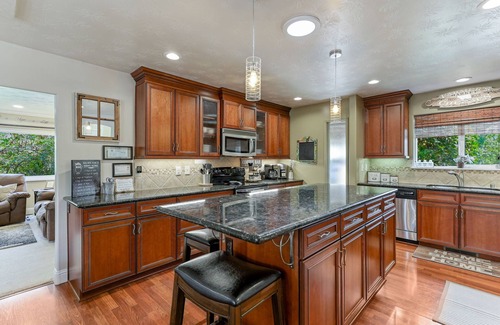 this 3000 sq ft 2 story home offers an open floor plan, with a large mud room, 4 bedrooms and 3 bathrooms The master bedroom has a cal-king bed with an ensuite featuring heated flooring, a walk in closet, and French doors that lead out to a small porch. Bedroom 2 offers a queen bed, bedroom 3 offers two twin beds and bedroom 4 offers a queen bed with a futon couch. All new bedroom furniture along with new bed linens. The kitchen is newly remodeled and is fully stocked and wonderful for multiple cooks on the large island. There is also a bbq on the deck. Downstairs offers a matchless 1,000 sq ft game room, featuring a pool table, foosball, ping pong table, dart board, wii and xbox gaming systems with 2 gaming chairs. A mini kitchen with fridge and microwave. The 4th bedroom is down stairs with the 3rd bathroom and large laundry room. There is a storage room door in the laundry room that is locked and unavailable for use. There is a large balcony with table and chairs and our backyard offers a gazebo with a fire pit and a bocce ball court. We provide unlimited wifi access with a large screen smart TV. For safety this house also features a motion censored camera at the front and rear entryways.