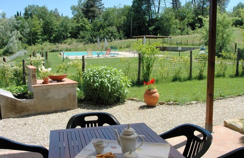 one of 5 beautiful apartments in farmhouse set on 14 acres of olive grove, each with private shaded verandas perfect for dining "al fresco"(sleeps 16+4) boasts a large infinity pool with its lovely gardens ,positioned so that the wonderful view can be enjoyed in the sunshine from early morning to sunset also a large communal panoramic terrace Superb private position above the medieval town of Figline Valdarno,.