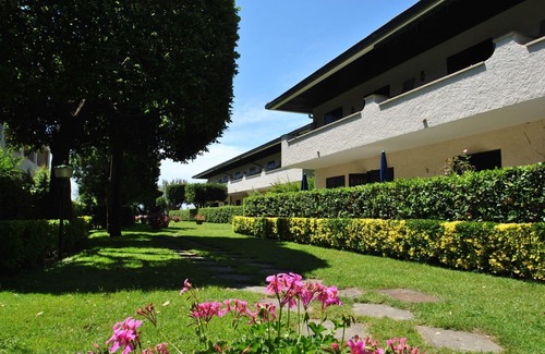 customers can enjoy private parking spaces, swimming pools, a large park with very tall pine trees, private gardens, a walkway to the beach, beach chairs and sun loungers