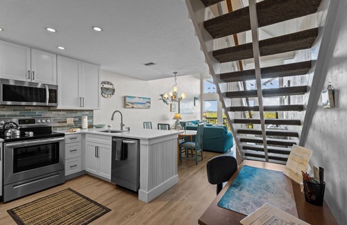 as you step inside, you'll be greeted by a stylish and spacious living area, updated stunning kitchen with an abundance of natural light The open floor plan seamlessly connects the living room, dining area, and kitchen, providing a perfect setting for enjoying your vacation. The fully renovated kitchen is a chef's dream, featuring sleek countertops, stainless steel appliances, and plenty to enjoy a night of cooking in.