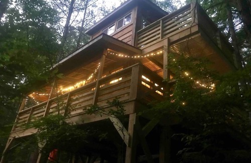 Firefly Bend Treehouse was built on the side of a hill in a bend of the creek. The treehouse is completely secluded and sits on 5 acres with 2 other treehouses and main cabin. You can enjoy the sounds of the creek and the birds as you relax in the hot tub. Located in the national forest you’ll be able to truly get away from it all. Hiking, Kayaking, Cycling can all be done nearby. Visit towns of Blue Ridge, Dahlonega or Blairsville. Enjoy nearby Vogel State park or Wolf Mountain Winery.