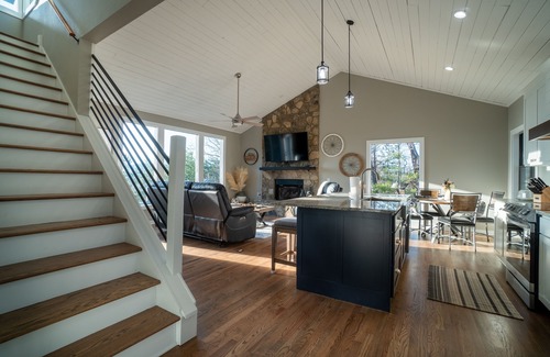 the main level features a spacious open-plan living area, a gorgeous, modern kitchen, dining area, master king bedroom, full bathroom and access to the main deck with a gas grill