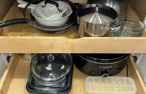 ~ kids arts & crafts in kitchen cabinet below countertop, below fish tank