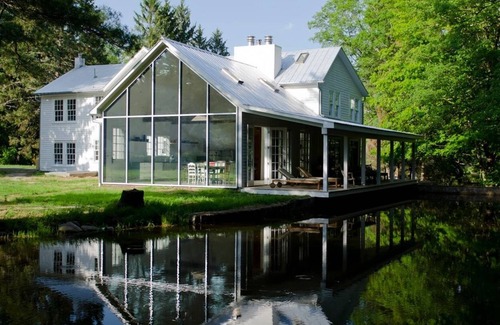 As featured in Dwell Magazine, Travel & Leisure and the Wall Street Journal: a mix of stunning modern architecture and old-world charm makes Floating Farmhouse, an 1820 manor home perched over a pristine Catskills creek and waterfall, an inspired vacation destination, company offsite/retreat venue, and film/photo shoot location. This celebrated home is perfectly situated within two hours of NYC, 2.5 hours of Philadelphia, and 15 miles of the area's most sought-after attractions, including world-class concerts at Bethel Woods, the Tusten hiking trails overlooking the Delaware River, skiing at Big Bear, the picturesque river town of Narrowsburg, and some of the finest dining and farmer's markets in the Catskills. Deliveries of farm-sourced, organic, and standard groceries and produce can be arranged ahead of arrival, and personal chef services, yoga/fitness class instruction, and massage therapy organized at Floating Farmhouse as well.