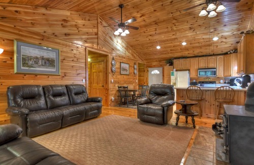 perched in the woods and offering incredible views, this log-sided cabin with a metal a roof is a great choice for the relaxation-focused vacationer The cabin has three bedrooms and two baths downstairs as well as a large bedroom upstairs, all of which are beautifully decorated. The inside walls, floors, and ceilings are beautiful pine wood. The spacious “great room” sports a wood burning stove with stone backdrop and the updated kitchen has plenty of counterspace to go around.