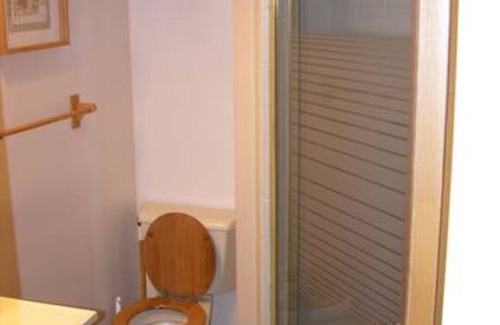 the bathroom has a stand-up, tiled shower; plenty spacious, but no tub