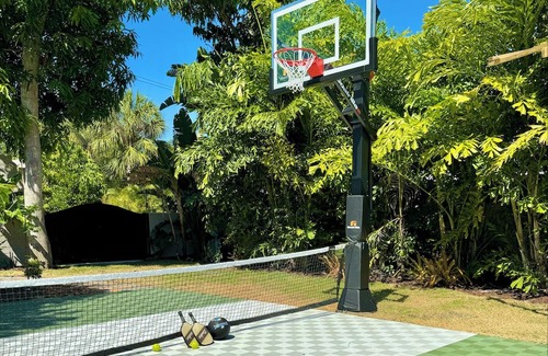 This listing contains two back to back listings to accomadate larger parties (9bd, 5.5bths). Lush botanical gardens and rare tropical fruit trees, 2 custom pools, spa, elite home gym, basketball / pickleball court. There is a fully-equipped kitchen, fireplace, TV, and dining space. Enjoy leisurely games of pool and shuffleboard, then retreat to the luxurious indoors with comfortable beds and a massive TV, all within the privacy of a walled-in estate. Your lavish escape awaits.