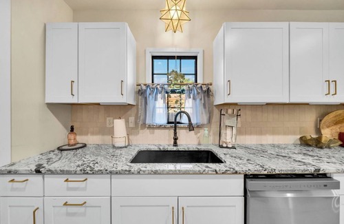 the brass tulip has been carefully designed beginning at the new front sidewalk Fresh paint, landscaping and a gorgeous front door welcome you into the space. The entryway has been hand-bricked in a herringbone pattern and the ceiling shaped into a rounded cove to create a beautiful entrance. As you enter the spacious living room, you’ll be greeted with soft wall sconce lighting surrounding the massive stone fireplace with electric insert that operates with a remote. The original hardwood floors have been restored and run the length of this home. Large deep sofa and additional seating create a cozy atmosphere in the living room where you can enjoy a 65” Smart TV. Next, you’ll enter the dining room where you’ll notice we have installed gorgeous vintage transom windows and a beautiful antique drop leaf table. Walk a bit further into the brand new large, fully-stocked kitchen with all new appliances, granite counters, gorgeous pendent lighting and the most beautiful brick wall. Above the stove, you’ll find a marble masterpiece featuring “brass tulips” and a pot filler to make preparing a delicious meal easy and fun. Around the corner you’ll be greeted with our coffee and wine bar complete with wine fridge and then a few steps further will take you into the laundry room.