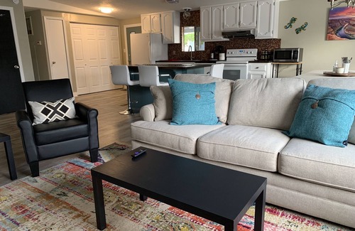 Enjoy easy access to boating, hiking, and site seeing at Lake Powell and 3 National Parks from this perfectly located home base in the middle of the Grand Circle. This newly renovated space is ideal for families or groups with lots of gathering spaces and free small boat/RV parking. Relax on the back patio with drinks, games and the chiminea. Three queen beds plus a queen sleeper sofa can accommodate up to 8 guests comfortably..