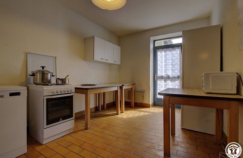 Group gîte on ground floor of former presbytery with 3 rural gîtes on upper floors. 3 bedrooms (for 5, 4 & 3 people - 80cm wide beds). 2 shower rooms. 4 showers. 2 WCs (1 with wheelchair access). Living room/kitchen. Enclosed courtyard with covered area. Rate/person/day depends upon number of people in group. Phone box on-site. Fishing, nature trail, sign-posted trail, sign-posted trails (mountain-biking, hiking, horse-riding), local history & heritage. Restaurant 20m away. Only Bouygues mobile phone network available..