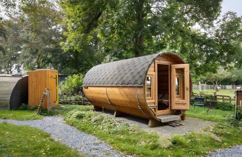 In Barlt, you will find this unique 18 m² glamping experience that offers everything you need for a relaxing stay in an extraordinary, barrel-shaped accommodation. There are comfortable seating and sleeping options for up to two guests. Your private bathroom is located exclusively for you in the main house, and a convenient composting toilet is available right next to the barrel. Wi-Fi is available for your private use, and breakfast can be booked on site for an additional fee. A washing machine is available to you upon request.