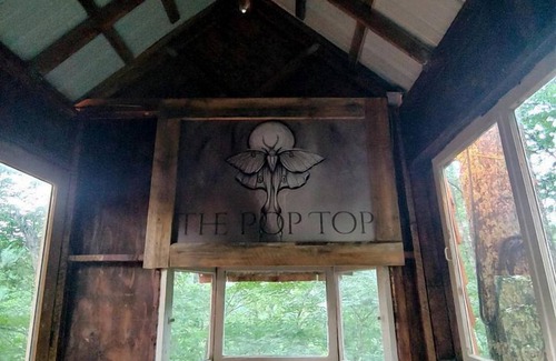 the pop top treehouse is in the crown of a 5-trunked poplar tree about 30 feet off the ground It has a ceiling fan, an outlet, desk, and is not recommended for those with a fear of heights. There are many other shared facilities on the property including an outdoor shower house and a common farmhouse..