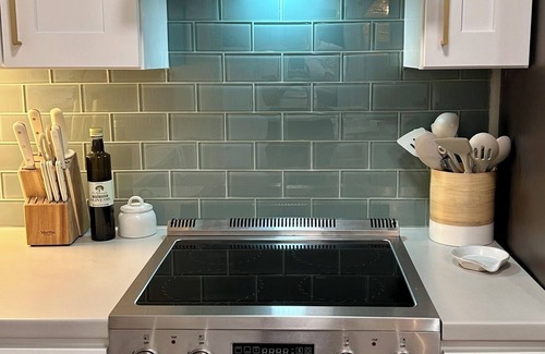 the apartment offers a stylishly furnished main living room and dining, a small but luxury kitchen, 1 primary bedroom with queen bed and ensuite bath, and a second bedroom with two x-long twin beds and a second hall bathroom, with amenities like ac, washer/ dryer, 55" smart tv with all the streaming services, wifi, a modern and fully-stocked kitchen, plenty of storage, and even a stand up desk and monitor for those needing to do a little work while on their holiday, two beach cruisers and plenty of beach toys are available as well