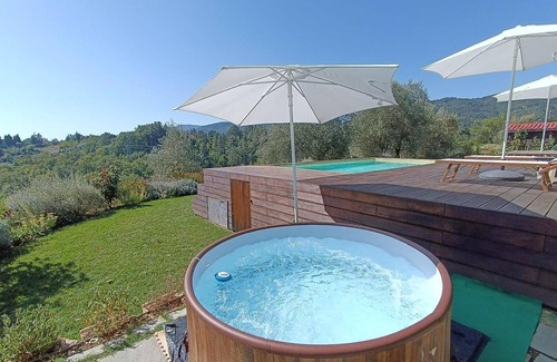 while sunbathing by the pool, let your eyes wander far and wide over the picturesque landscape Refresh yourself whenever you feel like it before getting comfortable again in the deck chair, or relax in the open-air jacuzzi.