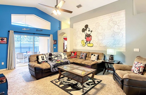 additionally, there is a private game room equipped with a pool table, foosball table, and an air hockey Each bedroom is adorned with a unique theme and Smart TV. The open-concept layout of the kitchen, living room and dining room overlooks the pool and backyard, enhancing your enjoyment of quality moments with loved ones.