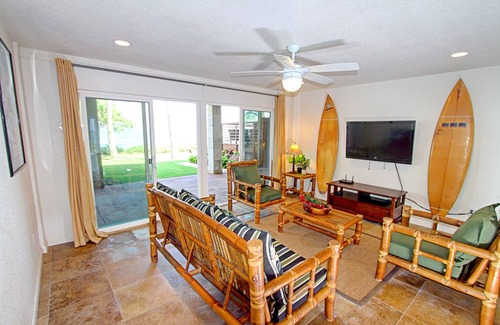 work on your tan in our lush tropical garden, or hang out in the shade of the covered lanai and take in the best of what the legendary north shore has to offer The main home is designed with 2 master bedroom suites, and each of the 5 bedrooms is designed to showcase stunning ocean views. The craftsman style living room opens directly to the covered lanai through a 16-foot wide pocket door, connecting you with the environment your entire stay. Our 1900 s.f. of covered lanais feature breathtaking 180 degree ocean views. From the comfort of our home, you can see the endangered Hawaiian Sea Turtles year round. The winter months bring the big waves, as well as breaching humpback whales you can view right from your room.