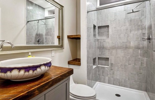 This gorgeous private studio rivals Baltimore's best 4-star hotels! Once a mystery church set for demolition, this beautiful new mid-century modern studio has been completely renovated to include everything you need and more, including private access, a fully equipped kitchenette, new hardwood flooring, and a stunning stone tile rain shower. Enjoy your best night's sleep with luxury down feather bedding, luxury amenities, and a new 55" smart TV. Beautiful French doors offer light and beauty..