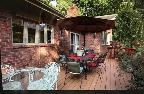 Beautiful private upstairs area of our home, with two bedrooms ...Master bedroom has a queen size bed and the second bedroom has a double futon..There are two full baths. Both recently remodeled with beautiful marble.Master bathroom with shower and one with shower and bath tub ..Beautiful kitchen and dining room and lovely deck with grill..With a beautiful view of our Forested 10 acre property.