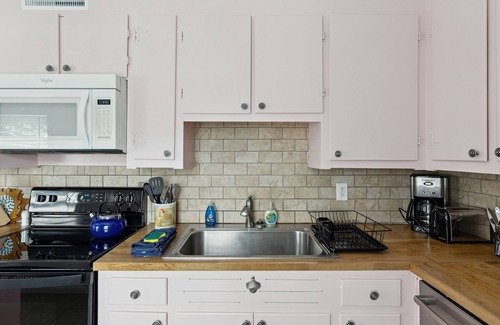 furnishings in the home include a comfy leather queen size pull out sofa for added sleeping space, a flat screen tv and cool vintage artwork to play up our hipster vibe The open floor plan invites use of the well equipped kitchen with updated appliances. The coffee maker takes ground coffee and has a cleanable filter, and a disposable paper filter can be used if desired. Both bedrooms have a king sized bed with quality linens, bedside furniture with adequate reading light, a flat-screen TV and custom furniture cabinetry.