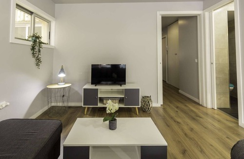 the living room includes a comfortable sofa that converts into a sofa bed, allowing the flat to accommodate up to seven guests The TV has direct access to Netflix for your entertainment.