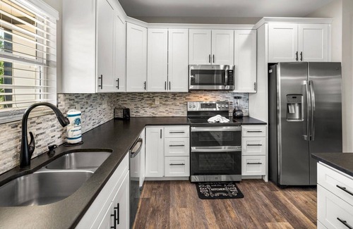 this gleaming kitchen is a gourmet dream! you get storage galore, stainless steel appliances, a double sink, extra-large fridge, and oodles of counter space thanks to a handy kitchen island The kitchen is fully equipped with all the cookware and serving and eating utensils you need. Head to the farmer’s market for the freshest produce, homemade sauces and marinades to add truly local flavor to your vacation cooking! Set up a breakfast bagel buffet or lunchtime taco bar on the island.