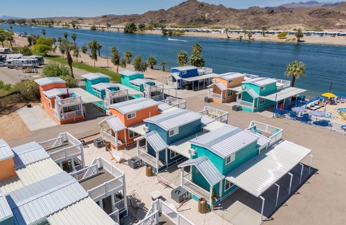 perched along the colorado river, 'hang up and hang out' at roadrunner resort offers a peaceful yet vibrant escape designed for relaxation and connection This spacious 2-bedroom, 2-bathroom bungalow accommodates up to 8 guests, featuring two queen-size beds and two cozy pull-out sofa beds—perfect for families and groups looking to unplug and unwind.