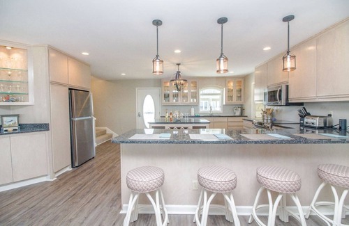 the kitchen has been recently updated with new granite countertops and stainless steel appliances, while keeping with the comforts of home Each morning, enjoy the sunrise with a hot mug of coffee directly from the Keurig coffee maker or a fresh smoothie using the Ninja blender. Meals are an easy set up with a breakfast bar able to seat five and an adjoining dining space, capable of seating a comfortable 8.