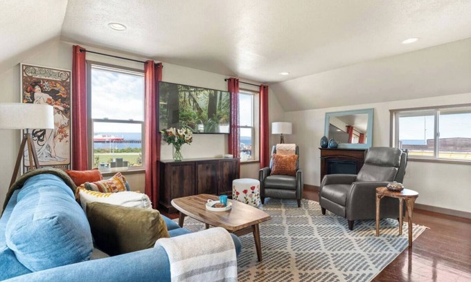 Welcome to the heart of downtown Port Angeles! This spacious, light-filled apartment perched above Foghorn Olive Oil Co. sleeps four and boasts panoramic views of the Strait of Juan de Fuca and Olympic Mountains. Just two blocks from the Victoria, BC ferry and across from Field Arts Hall, it offers unmatched access to fine dining, boutique shopping, and cultural events—plus the Olympic National Park entrance is just 10 minutes away! Enjoy the best of Port Angeles from this centrally located, stylish apartment in the heart of downtown.