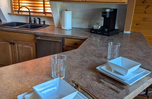 the main floor includes a bathroom, kitchen, living room, and bedroom The kitchen is equipped with a microwave, refrigerator, oven, and dishwasher. The kitchen has a variety of cooking essentials including but not limited to plates, bowls, drinking glasses, wine glasses, silverware, pots, pans, cooking utensils, cutting boards, food storage containers, spices, cooking oil, saran wrap, foil, etc. The kitchen has an island with four bar stools. No condiments provided.