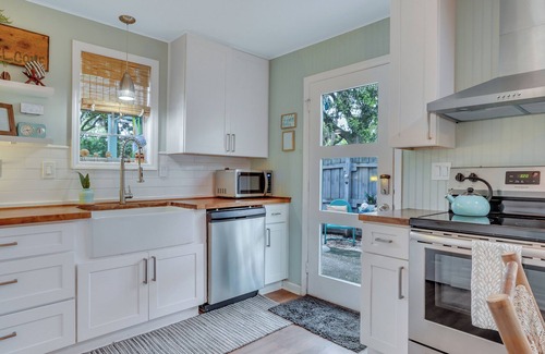 the kitchen in salt palms cottage is tucked neatly behind a brick barrier that divides it from the living room The highlight of the home, this all-white kitchen features touches like a farmhouse sink, butcher-block countertops, open shelves, and breakfast nook with built-in bench seating. The kitchen is also fully equipped with full-sized, all-new appliances in stainless steel. This is a full kitchen in every sense of the word that offers an oven, dishwasher, refrigerator, and microwave. The door in the kitchen opens up directly to your private backyard oasis.