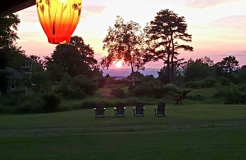 the outside environs (surrounded by eleven plus private acres of wooded, family-owned property) boast inviting wraparound porches/patios with lovely sunset views, warm southerly exposure, a seven-person deluxe hot tub, fire pit, weber grill, hammock, stone-walled entrance, ample free parking, circular drive, adirondack chairs, etc, all in a quiet, peaceful setting.