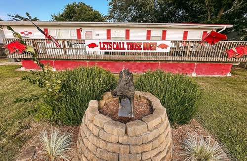 The Hog House is decorated from top to bottom with Arkansas Razorback decor! This beautiful home sleeps 10-12, people, depending on your group. We totally remodeled the home, inside and out, in the summer of 2012. EVERYTHING in this house is Razorback themed or red and white! This 5BR 2BATH home has a fully stocked kitchen, a brand new gas grill, and all linens and towels are provided. The master bedroom has a king bed. Three bedrooms have queen beds. One bedroom has a twin over full bunkbed. The Hog House has a full size washer and dryer, all new appliances, and 7 flatscreen Smart TV's. The house has top speed WiFi. There is a small upstairs room with a beanbag couch, and TV. The back yard of the Hog House is fenced in. The enormous deck on the front of the house is perfect for tailgating or family cookouts. Sit out on the deck after a big Razorback win and watch the excited fans drive by as they leave the game. You'll be back to the Hog House relaxing while everyone else is stuck in traffic! The Hog House is walking distance to Razorback Road where Bud Walton Arena and Razorback Stadium are located. It's an easy walk to the games, less than a mile. You will see hundreds of fans walking this same route.