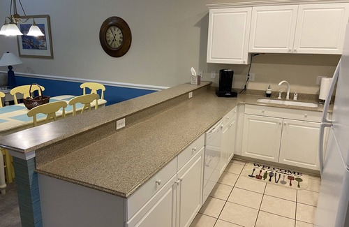 the main living room has new carpets, a new couch, a new 58” smart tv, dining room table that seats 6 people and seating for 3 others on the kitchen high top counter There is also a desk for anyone who needs to take care of work while on vacation. The kitchen is fully stocked with a Keurig, 12 cup coffee pot, toaster oven with a pizza stone, blender, electric griddle, crockpot, microwave, dishwasher, disposal, and other cooking supplies. There is a washer and dryer in the unit.