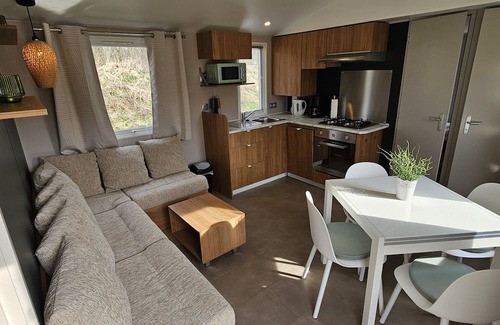 the new chalet offers a living area of about 31m² This modern mobile home has 2 bedrooms, a bedroom with a double bed with gel foam topper measuring 160 x 200 cm and a children's room with two single beds measuring 80 x 190 cm, each equipped with wardrobes.