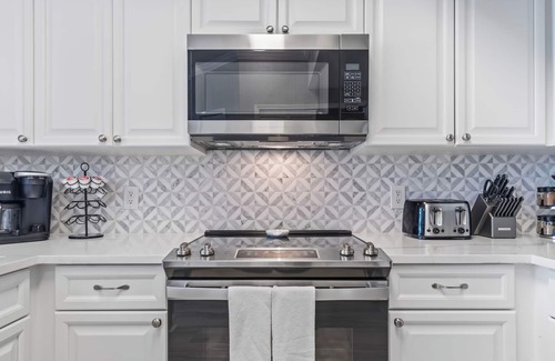 - fully equipped kitchen with stove, oven, dishwasher, microwave, and small appliances