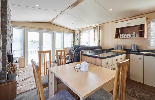 the open-plan living, kitchen, and dining area is the heart of the lodge Sink into the plush corner sofa and enjoy pure relaxation, or gather with your loved ones to share stories and laughter. Smooth wooden panelling and thoughtful personal touches create a warm, welcoming charm, while in the summer months, you can open the doors and let the fresh coastal breeze flow through.
