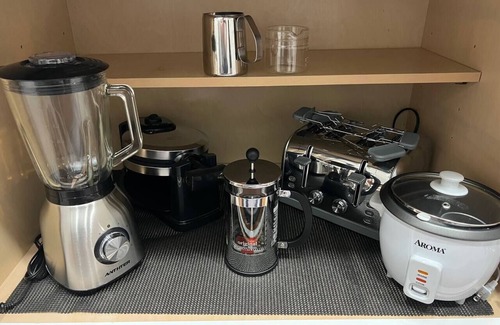 a complimentary coffee and tea bar has been stocked for your enjoyment, please help yourself The brightly lit dining area seats four guests.