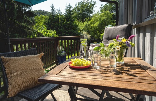 You live in a quiet holiday home in a south-facing slope on the outskirts of Dattenfeld. The Non smoking house has a floor space of 50 m² plus wooden terrace. You stay in a large living and dining room with kitchenette, which is equipped with ceramic hob, oven, refrigerator, microwave, coffee maker, kettle, blender and toaster. In addition to TV and radio we offer free internet access. You can park directly at the house. From the property leads a 50 m long footpath directly to the victory or fortified victory hiking and cycling. Ideal conditions for anglers, cyclists and hikers. You will find shops on site in two about 400 meters from supermarkets.
