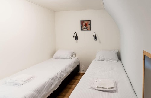 layout: ground floor: (open kitchen(electric kettle, coffee machine, combination microwave, dishwasher, fridge), living/diningroom(tv), bedroom(double bed or 2 single beds), bedroom(2x single bed), children's bedroom(bunk bed), bathroom(shower, washbasin, toilet)) heating(floor heating), terrace, parking