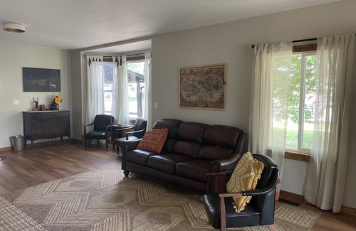 A comfortable, home away from home. The porch offers a great outdoor space for evening entertaining. All the living spaces are for visiting, game night, or relaxing with others without being squished in. This is a great place for many to gather..