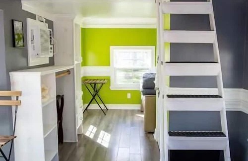 the tiny home is a converted rv There is a kitchen area with a stove, refrigerator, small convection oven and microwave. There movable tables/trays for dining. The bathroom has a toilet, shower and sink. There is a full size bed in a loft and a queen size futon. It can comfortably sleep 3 people. Pets are allowed for a $50 non-refundable fee. Pets must be kenneled if left inside alone and on a leash at all times when outside.