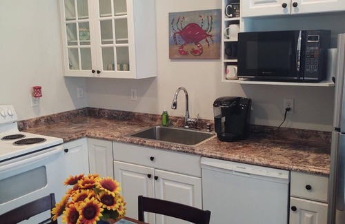 kitchen: we supply a fully equipped kitchen which includes crock pot, auto drip coffee pot with coffee provided, keuriq, blender, toaster, fry pans and sauce pans and a 9x13 baking pan There is also a large stock pot for cooking up Frogmore stew or your favorite soup. There are plenty of dishes, cups and flatware. There is a microwave and dishwasher. We also have measuring cups and spoons, cutting knives and a pizza pan.