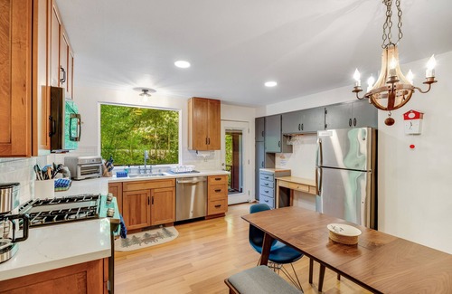outside, enjoy the sights of the majestic redwood forest and the sound of the burbling creek below while you fire up your gas grill and dine alfresco on your large, furnished deck A path leads directly to a dazzling stretch of Austin Creek where you can relax and play while you plan your next day's adventures.