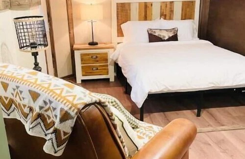 the home has modern and vintage elements not lacking in unique charm or character including its high exposed wood beam ceilings upstairs and wood accents throughout the home can sleep up to 9 with 2 queen bedrooms, 1 room with a full and 2 twin bunk bed, 1 room with a built in twin bed and a futon couch in the living room.