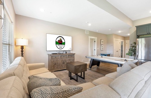 this luxurious seven-bedroom seven-bathroom lodge is conveniently located a half-mile off of the famous highway 76 country music boulevard It includes a full kitchen and dining area on the main level, a kitchenette and a smaller dining area on the lower level, and two great rooms with 75" 4K Smart TVs, Blu-Ray Players, and queen-size sofa beds. Four bedrooms feature king beds, two bedrooms offer a king bed and twin daybed, and one bedroom has three double bunk beds. Enjoy an incredible view of our golf course from two large decks, a gas grill and firepit, regulation-size backyard games, two sets of washers and dryers, and free wireless internet. Within a very short drive, guests have access to the resort's indoor and seasonal outdoor pools.