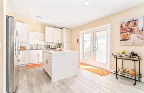 accommodations include a primary suite with a king bed and rain shower, a queen bedroom, and a versatile third room, the sunset room, which serves as a creative retreat and includes a twin bed and a lounge chair that converts to a bed This recently renovated home is tastefully decorated with desert accents and country-western decor.