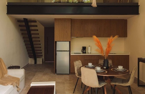 escape to this stunning one-bedroom apartment in tulum Featuring a king-size bed, fully equipped kitchen, spacious living room with a sofa bed and smart TV, and a private terrace with jungle views. Enjoy the rooftop and community pools, a gym, and 24/7 security. Perfect for a serene getaway! Your reservation includes complimentary concierge service, and preferred access to some of the best beach clubs in Tulum.
