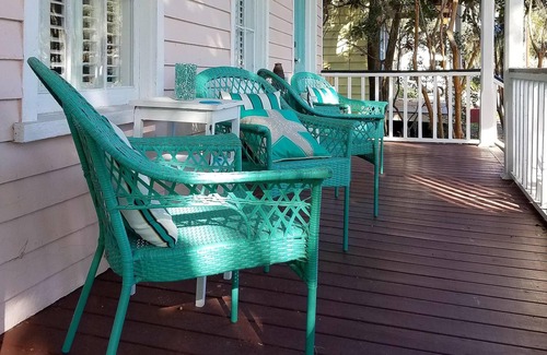the historic home features double front porches shaded by a beautiful spanish moss draped live oak tree Both the upper and lower porches provide outdoor seating. This home is perfect for enjoying the mild southern climate and marsh breezes. Pull up a chair, sip on a glass of southern sweet tea and sit awhile.