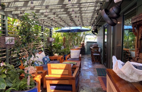 this home opens to a tropically landscaped environment with a large outdoor living space The outdoor daybed is a perfect space to enjoy a book on the private and quiet lanai. Trade winds provide ample natural cooling through the cottage’s abundant louvered and patio windows.